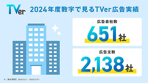 2024年度にTVer広告に出稿した広告会社数は651社、広告主数は2,138社となった。同社では、2023年より販売を開始したセルフサーブ機能(広告会社による入稿・配信・レポーティングが可能)により、出稿企業が増加したとしている。