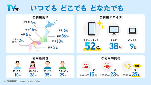 利用地域としては「関東」が36%、「近畿」が18%、「中部」が16%の順に。利用デバイスは「スマートフォン」が52%、「テレビ」が38%となった。また、利用者の属性は「20-34才」が26%、「35-49才」が35%、「50-64才」が29%で、シニア層も積極的に利用していた。特に利用されている時間帯は「夜」が37%で圧倒的だった。