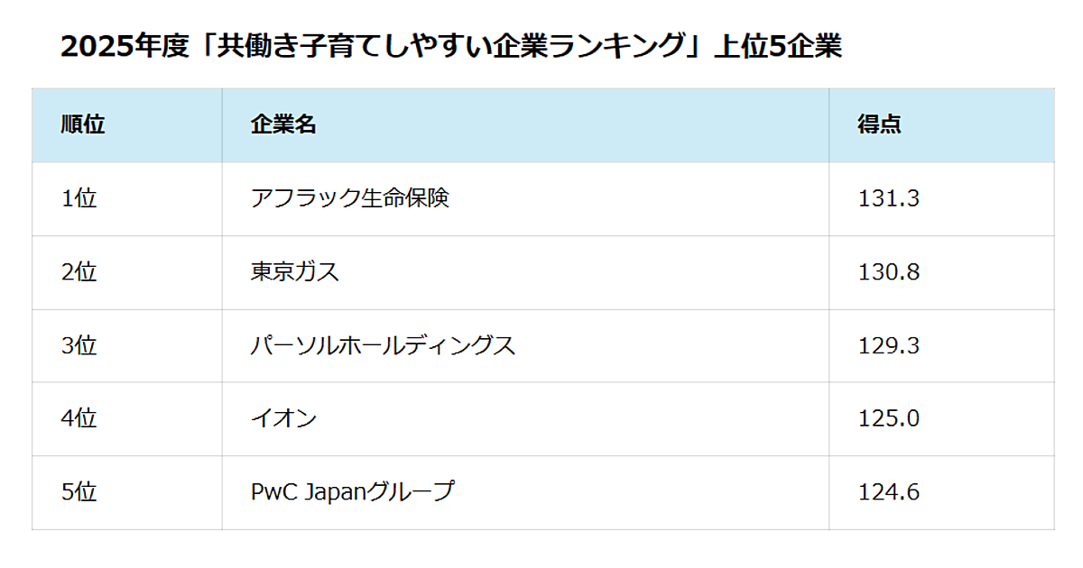 日経BPの働く女性向けウェブメディア「日経クロスウーマン」は、2025年版「共働き子育てしやすい企業ランキング」を発表した。同社が発行する女性誌「日経ウーマン」と、日本経済新聞社グループの「日経ウーマノミクス・プロジェクト」が実施した「企業の女性活躍度調査」の部門賞として、467社から得た回答を基に、独自指標で作成した。