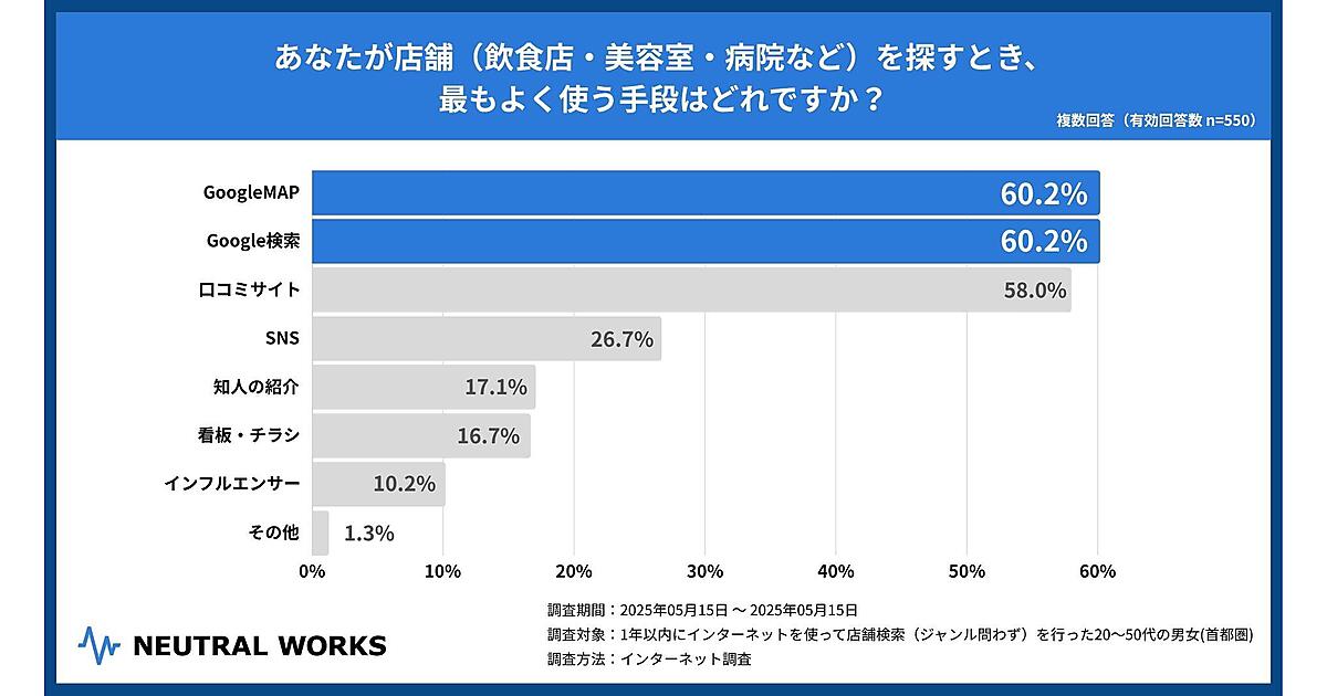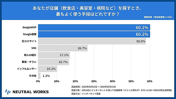 ニュートラルワークスは、店舗探しの際の検索行動に関する調査を実施した。20~50代の男女550名が回答している。
