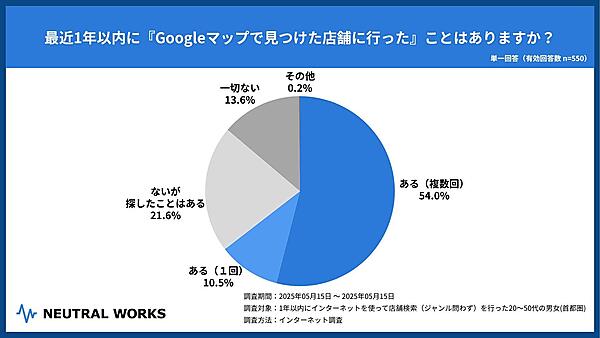 また、過去1年以内にGoogleマップで見つけた店舗に実際に訪れたことがあるかを聞くと、64.5%が「ある」と回答。また、54.0%は「複数回訪問している」と答えており、Googleマップの影響力がうかがえた。