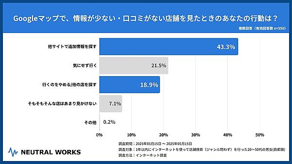 Googleマップ上で「情報が少ない」「口コミがない」店舗を見たときどうするかという質問では、「他サイトで追加情報を探す」が43.3%、「行くのをやめる/他の店を探す」が18.9%という結果に。店舗側としては、機会損失につながる可能性があることが明らかになった。