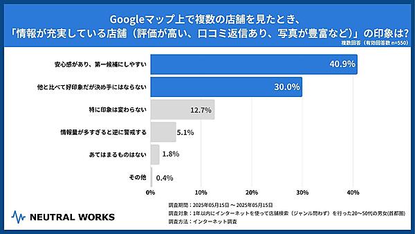 情報が充実している店舗の印象としては、「安心感があり、第一候補にしやすい(40.9%)」「他と比べて好印象だが決め手にはならない(30.0%)」が上位2つに。評価やクチコミ、店舗の写真などが、来店意欲を高める効果があることがわかった。