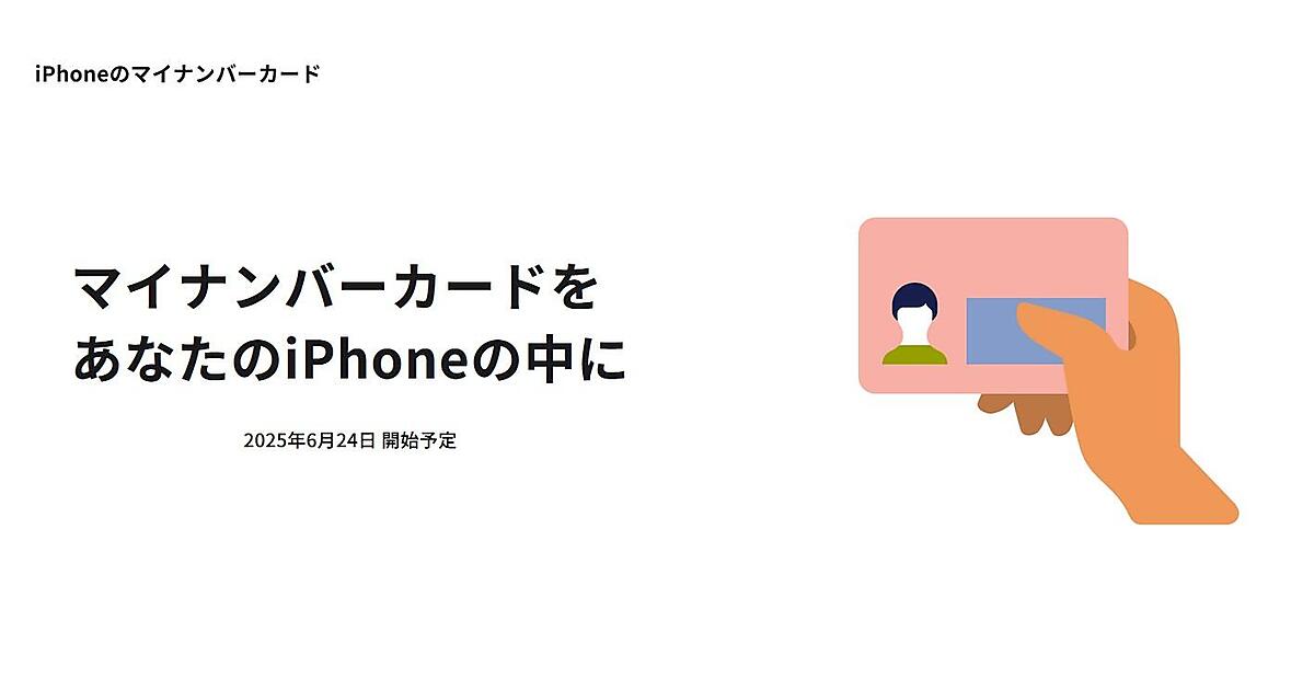 デジタル庁は、マイナンバーカードをiPhoneの「Appleウォレット」に入れて利用できる「iPhoneのマイナンバーカード」を6月24日から開始すると6月6日に発表した。実物のカードがなくても「Face ID」(顔)や「Touch ID」(指紋)の生体認証で各種行政サービスを利用できる。iPhoneへの追加には「マイナポータルアプリ」と実物のマイナンバーカード、券面入力用暗証番号(数字4桁)、署名用パスワード(英数字6~16文字)の4点が必要。
