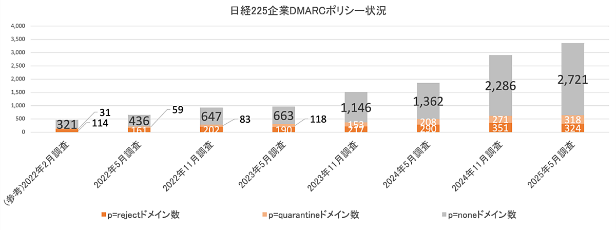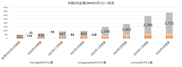 まず日経225企業のDMARC導入状況については、208社(92.4%)が少なくとも1つのドメインでDMARCを導入していた。Google/米Yahoo!の送信者向け新ガイドライン(2023年10月発表)が後押しし、2024年5月時点で91.6%だったが、以降はほぼ横ばいで推移している