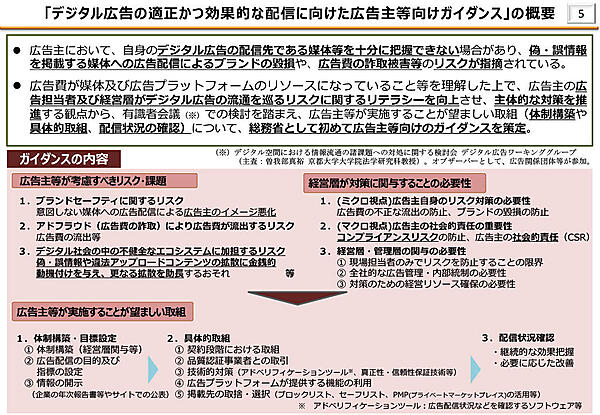 ガイダンスでは、体制構築・目標設定▽具体的取り組み▽配信状況確認--の3段階で対策を例示した。体制構築・目標設定は①経営層の関与などの体制構築②広告配信の目的と指標の設定③情報開示。具体的取り組みは①契約段階での取り組み②品質認証事業者との取引③技術的な対策④広告プラットフォームの機能の利用⑤配信先の取捨選択--を挙げた。