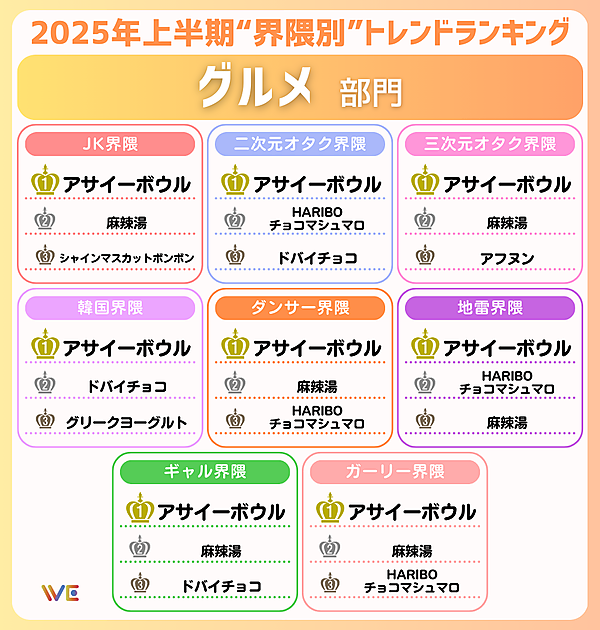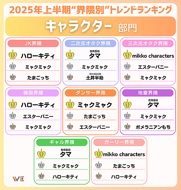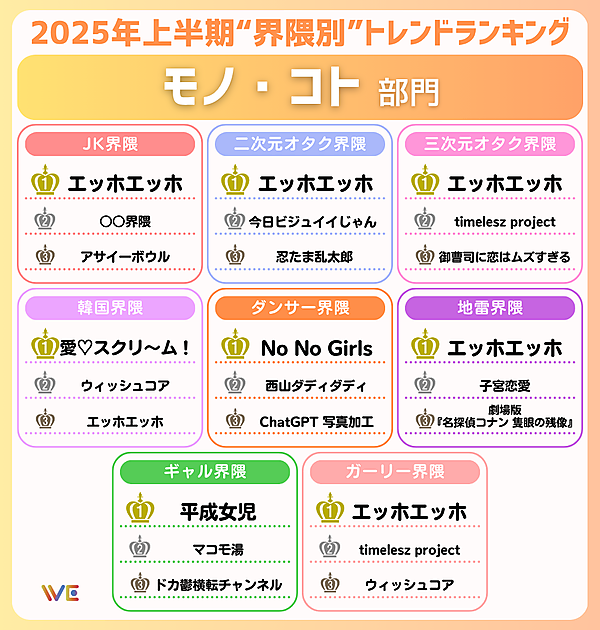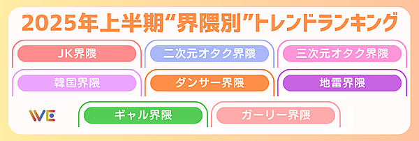 この調査では、Z世代の消費動向を8つの「界隈」ごとに細分化して、2025年上半期のトレンド(9部門)をランキング化した。界隈としては、「JK界隈」「二次元オタク界隈」「三次元オタク界隈」「韓国界隈」「ダンサー界隈」「地雷界隈」「ギャル界隈」「ガーリー界隈」の8つに区分されデータ分析されている。