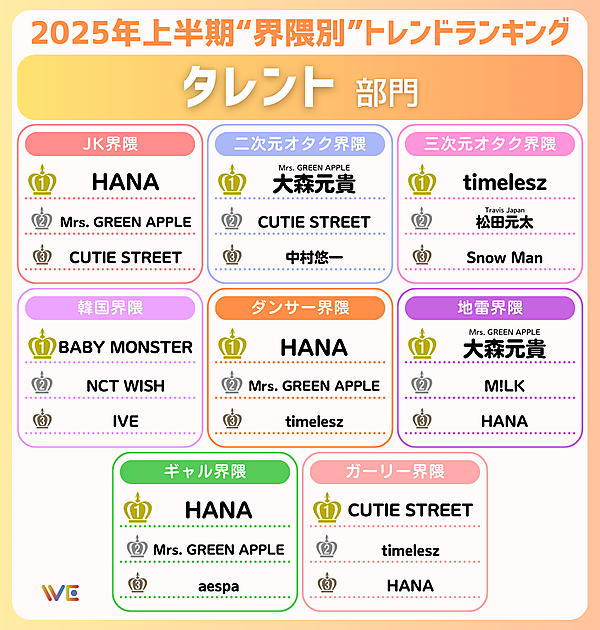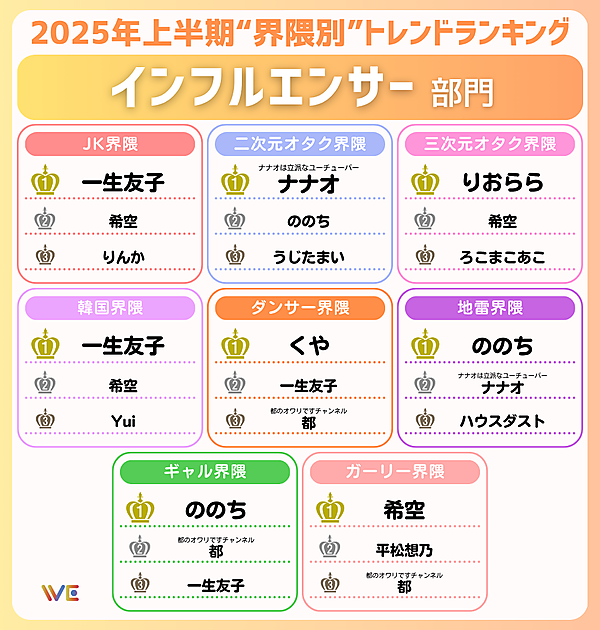 インフルエンサー部門は、界隈によって支持が分散したが、JK界隈で特に人気を集めた「一生友子」が複数界隈でランクイン。その他では「ののち」「ナナオ」「りおらら」「希空」の名前が上位にあがった。タレント部門では、『No No Girls』から誕生し2025年4月にデビューを果たした7人組ガールズグループ「HANA」とMrs. GREEN APPLEボーカル「大森 元貴」が上位となった。なお、Mrs. GREEN APPLEはグループでのランクインを果たしている。