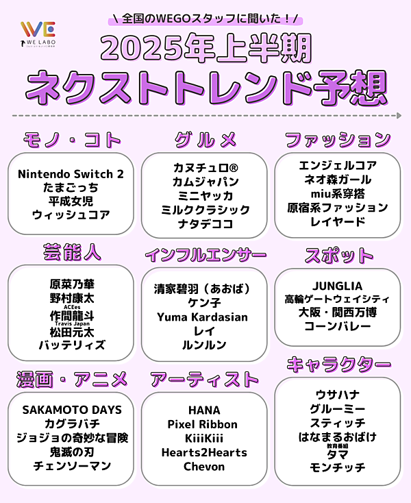 なお、同調査では、全国約180店舗のWEGOスタッフ554人による「2025年下半期ネクストトレンド予想」の結果も発表。「Switch 2」「ネオ森ガール」「原菜乃華」「松田元太」「清家碧羽(あおば)」「大阪・関西万博」「カグラバチ」「HANA」「Pixel Ribbon」「ウサハナ」などの名前があがった。