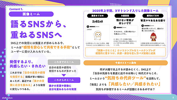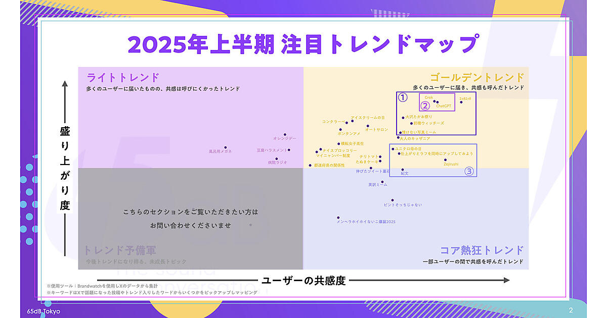 TBWA HAKUHODOのマーケティング組織である「65dB TOKYO」は、「2025年上半期SNSトレンド徹底解剖」を公開した。2025年1月から5月までのX(旧Twitter)における約20億件の投稿を分析し、生活者の共感行動や企業との接点、AIとの関係性などをまとめている。