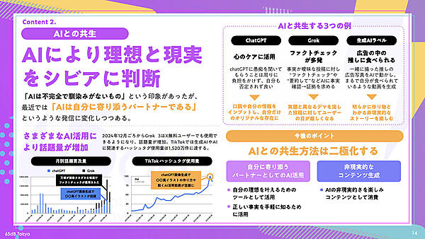 AIが急速に日常に浸透したというのも2025年上半期の特徴的な点だ。Xで広がる「Grokによるファクトチェック文化」では、事実かどうか曖昧な投稿に対し、「ファクトチェックして」「要約して」とGrokに指示する行動が一般化した。また、ChatGPTを心のケアに活用する人や、「AI生成ラベル」をつけて非現実的なコンテンツを生成して楽しむ人なども目立った。