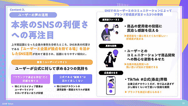 SNSでの企業とユーザーのコミュニケーションにおいては、「フランクで身近な存在」かつ「公式である"誠実さ"」が鍵だと分析された。商品の愛用者の投稿に感謝のリプライをする、商品開発への真摯な姿勢を示す、広告感のない・作り込みすぎない投稿を展開するなどが、ブランド好感度が高まった事例として紹介されている。