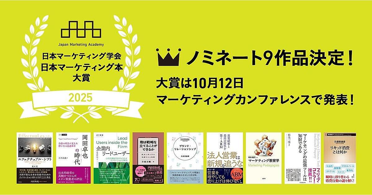 マーケティングに関する研究を行う学術団体の日本マーケティング学会は、「日本マーケティング本 大賞2025」のノミネート9作品を決め、6月10日に公表した。この中から学会員の投票で大賞と準大賞を決め、10月12日に開く同学会の研究大会「カンファレンス2025」で発表・表彰する。