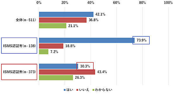 さらに要請を受けた経験がある企業のうち、ISMS取得済みの企業の73.9%が、発注元からの要請でサイバーセキュリティ対策を行ったことが取引につながったと回答しているのに対し、ISMS未取得の企業は30.3%にとどまった。やはり第三者認証を取得している企業のほうが信頼されると推察される。