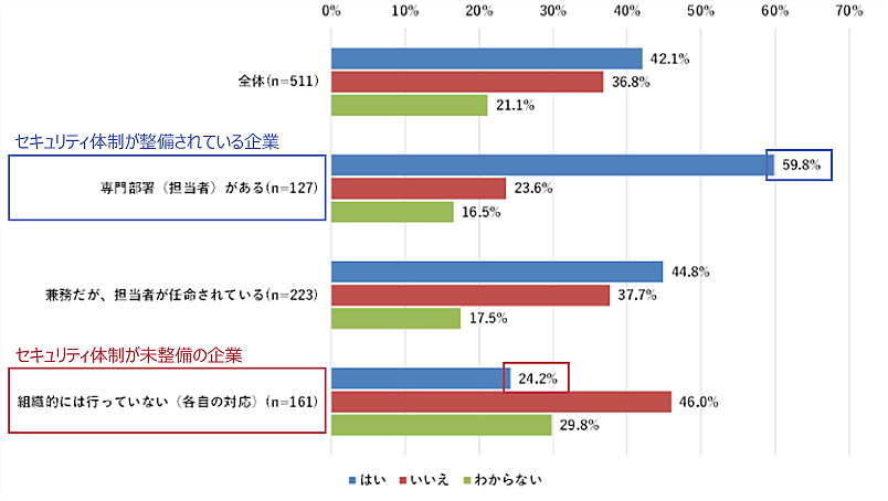 こうした「セキュリティ対策の実施が取引につながったかどうか」を聞くと、セキュリティ体制の整備がされている(専門部署がある)企業の59.8%が「つながった」としたが、セキュリティ体制の整備がされていない(セキュリティ対策は各自の対応に任せている)企業だと「つながった」は24.2%にとどまった。