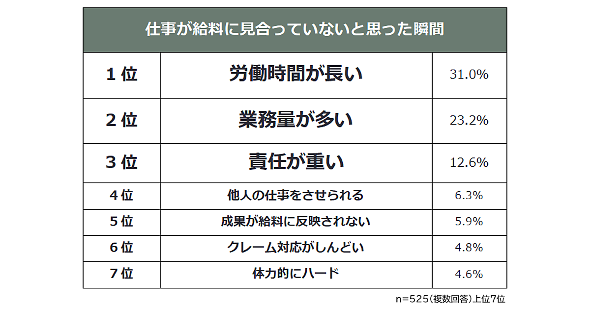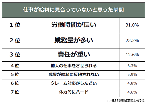仕事が給料に見合っていないと思った瞬間1位は「労働時間が長い(31.0%)」。残業・休日出勤など、通常の勤務時間外の労働に対する不満が多く挙げられている。2位は「業務量が多い(23.2%)」、3位は「責任が重い(12.6%)」と続いた。