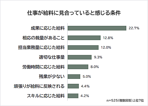 仕事が給料に見合っていると感じる条件としては、1位は「成果に応じた給料(22.7%)」で、インセンティブや成果報酬に魅力を感じている人が多かった。2位は「相応の裁量があること(12.8%)」、3位は「担当業務量に応じた給料(12.0%)」と続いている。