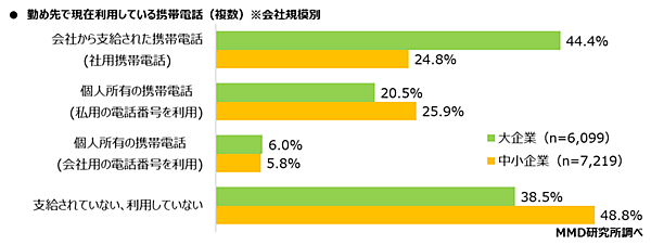 大企業(従業員300人以上)/中小企業(従業員300人未満)の会社規模別だと、「会社から支給された携帯電話(社用携帯電話)」は大企業が44.4%なのに対し、中小企業は24.8%にとどまる。逆に「支給されていない」「個人所有の携帯電話(私用の電話番号を利用)」は中小企業が上回る。