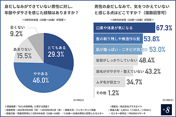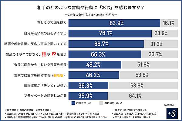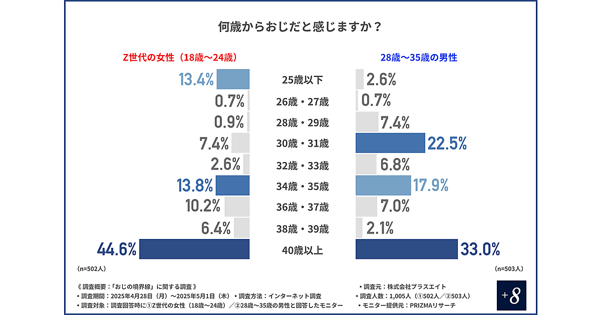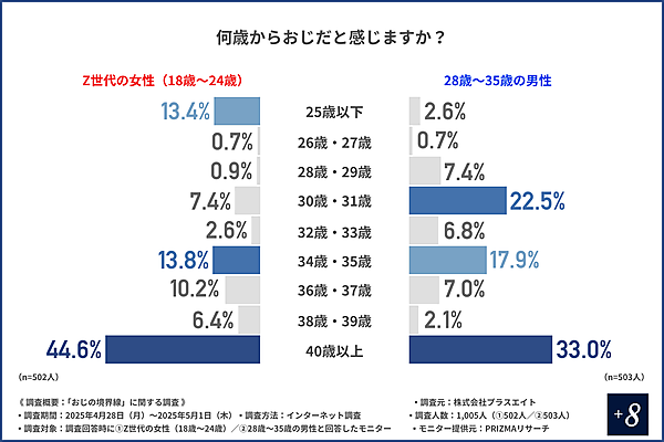 メンズ眉毛サロンを運営するプラスエイトは、「おじの境界線」に関する調査結果を発表した。18歳~24歳のZ世代女性502人、28歳~35歳の男性503人から「おじ」(中年男性)について回答を得ている。