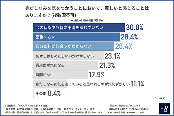 逆に28歳~35歳の男性は「身だしなみの気づかいで、難しいと感じること」に対して、「今の状態でも特に不満を感じていない」30.0%、「面倒くさい」28.4%、「自分に何が似合うかわからない」26.4%が上位で、対策していない現状がうかがえる。