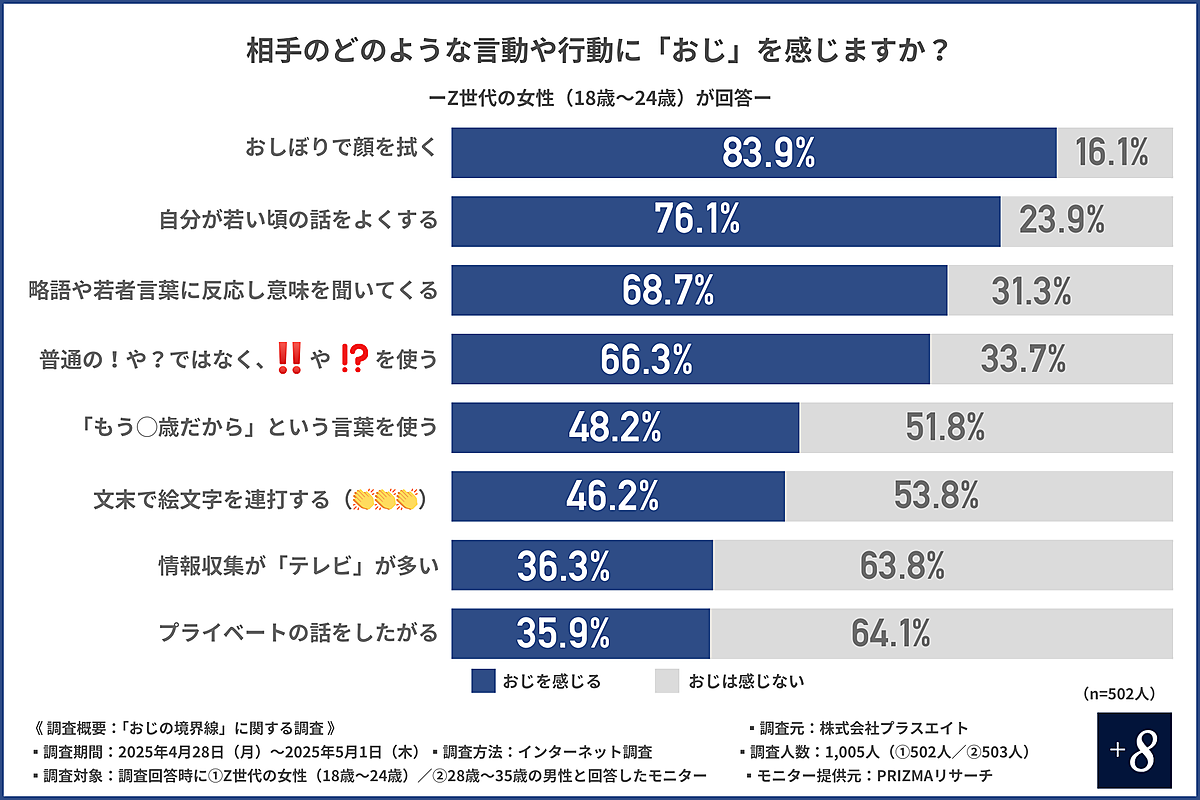 そこでZ世代女性に「相手のどのような言動や行動に『おじ』を感じるか」を聞くと、最多だったのは「おしぼりで顔を拭く」83.9%。以下「自分が若い頃の話をよくする」76.1%、「略語や若者言葉に反応して意味を聞いてくる」68.7%、「普通の!や?ではなく、絵文字を使う」66.3%などが上位だった。「おしぼりで顔を拭く」のが圧倒的におじを感じさせるとともに、特に武勇伝や自分語り、絵文字多用が若者とのズレを感じさせてしまうようだ。
