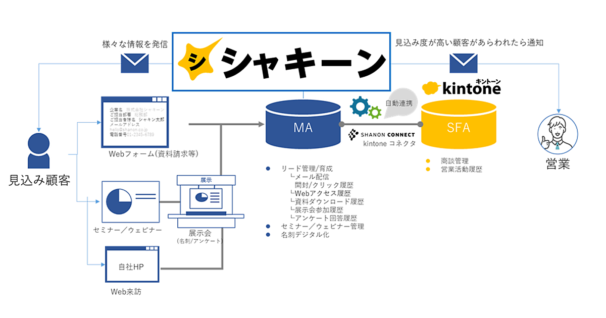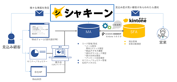 kintoneは、自社の業務に合ったアプリが、IT知識がなくてもノーコード・ローコードで作成可能。顧客管理、出張申請、業務日報などさまざまな用途に利用できる。業務の変化に応じた改良も容易。シャノンMAは、見込み客の情報を一元管理してマーケティング業務を自動化・効率化するツール。kintoneと連携することで商談管理、営業活動履歴が活用できる。