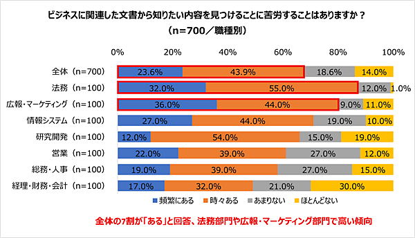 一方で、ビジネス文書に関連した文書から知りたい内容を見つけることに苦労することがあるかを聞くと、全体ではある・時々あるの合計が67.5%となった。職種別で見ると、「法務部門」では計87.0%、「広報・マーケティング部門」では計80.0%と、特に高い傾向が見られた。
