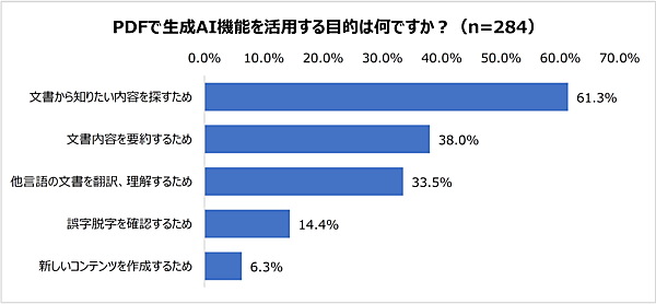 生成AI機能の活用目的としては、「文書から知りたい内容を探すため」が61.3%で圧倒的に多く、ついで「文書内容を要約するため」が38.0%、「多言語の文書を翻訳、理解するため」が33.5%と続いた。
