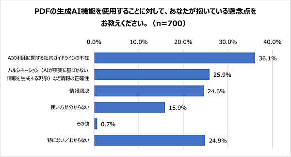 生成AI活用における懸念点としては、「AIの利用に関する社内ガイドラインの不在(36.1%)」「ハルシネーションなど情報の正確性(25.9%)」「情報漏洩(24.6%)」などが上位に。一方で「特にない/わからない」も24.9%にのぼっており、業務でのAI利用に関する理解度や関心のばらつきがうかがえた。