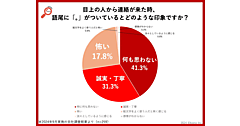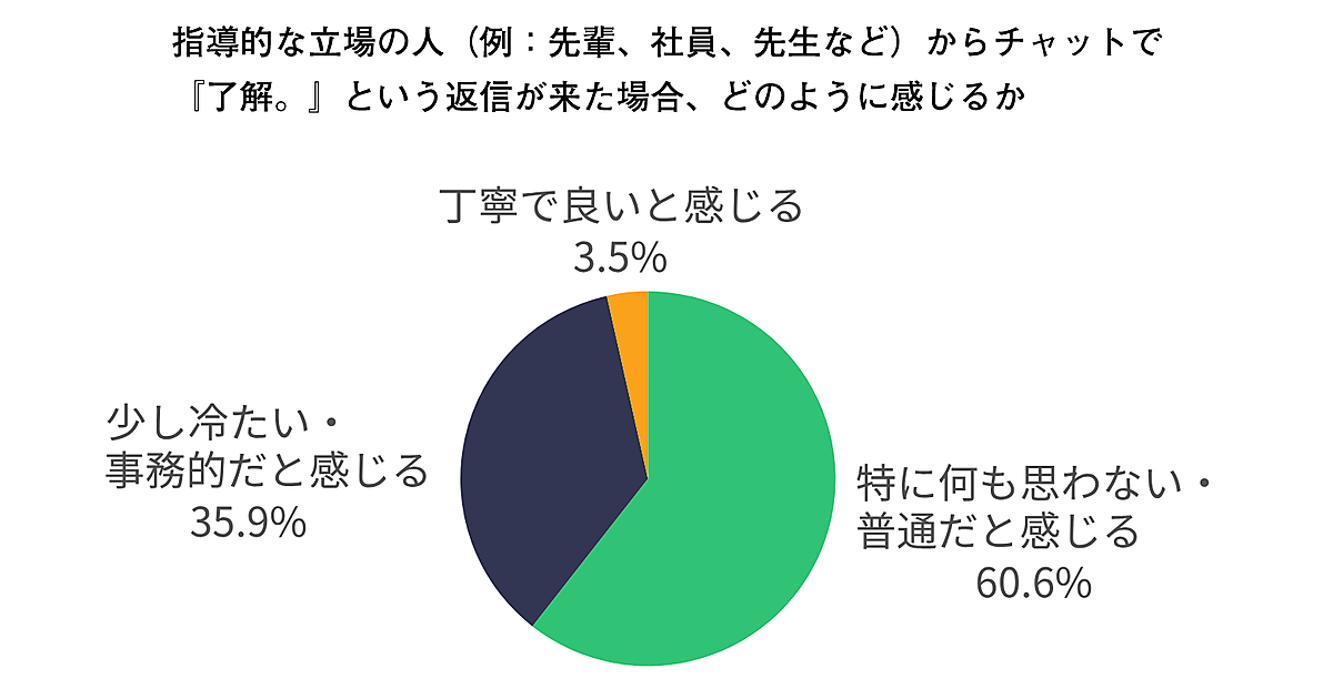 「指導的な立場の人(例:先輩、社員、先生など)からチャットで『了解。』という返信が来た場合、どのように感じるか」を聞くと、「特に何も思わない・普通だと感じる」60.6%が多数だったが、「少し冷たい・事務的だと感じる」35.9%も3割以上存在。「ていねいで良いと感じる」は3.5%と極めて少数で、3人に1人以上はネガティブな印象を抱いていると言える。
