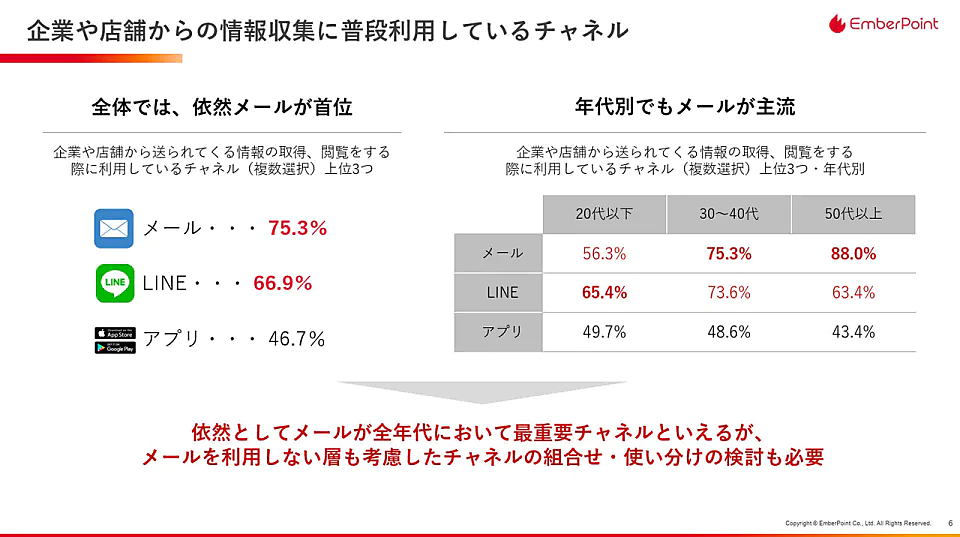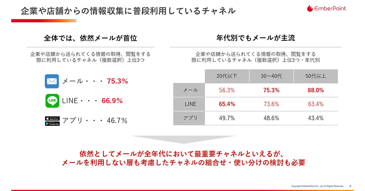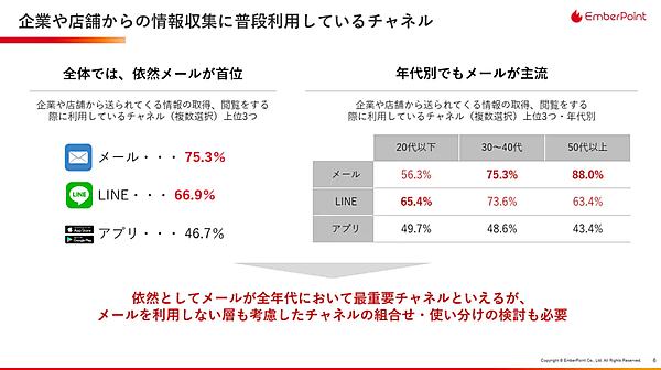 - 企業や店舗からの情報収集チャンネルとして、全体では依然として「メール」75.3%がもっとも利用されているが年代別だと20代以下では「LINE」が「メール」を上回っている