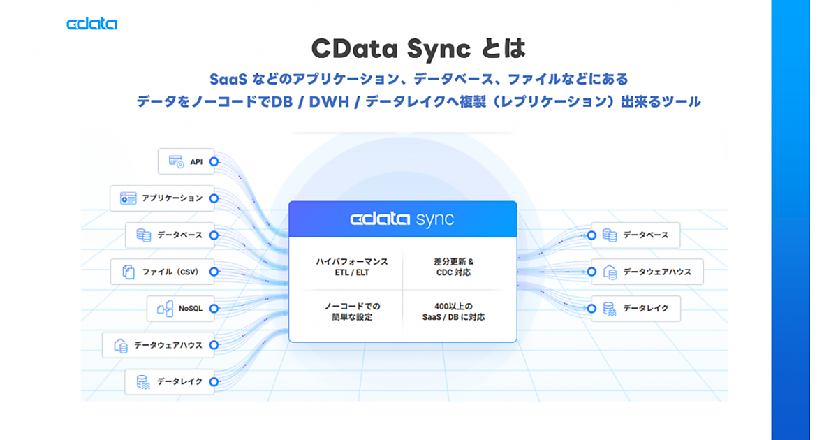 CData Syncはクラウドやオンプレミス(自社所有)など複数の異なるSaaSやデータベースに分散した情報を1つに統合するデータ連携ツールで、400種類超の幅広いデータソースに対応する。DWH(データウェアハウス)構築、レプリケーション(複製技術)、SaaSデータのデータベース化など多様な用途に利用できる柔軟なデータ処理が可能。ブラウザベースの直感的なインターフェースからデータの抽出、転送、加工などの操作を容易に行える。