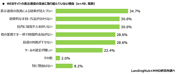 そこで「Webサイトの表示速度を改善項目として捉えているが、改善に取り組んでいない」と回答した49人にその理由を聞くと、「表示速度の改善による効果が見えづらい」34.7%、「効果的な手段・方法が分からない」「社内に知見や人材がいない」各30.6%だった。
