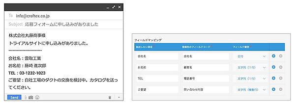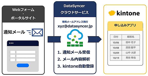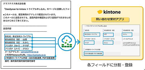 ノーコード・ローコードツール「kintone(キントーン)」を活用した業務改善サービス事業のクラフテクスは、kintoneとウェブフォームを自動連携するクラウドサービス「DataSyncer(データシンカー)フォーム to kintone」を6月24日に始める、と6月23日発表した。ウェブフォームなどから送信される通知メールを解析してkintoneに自動登録する。