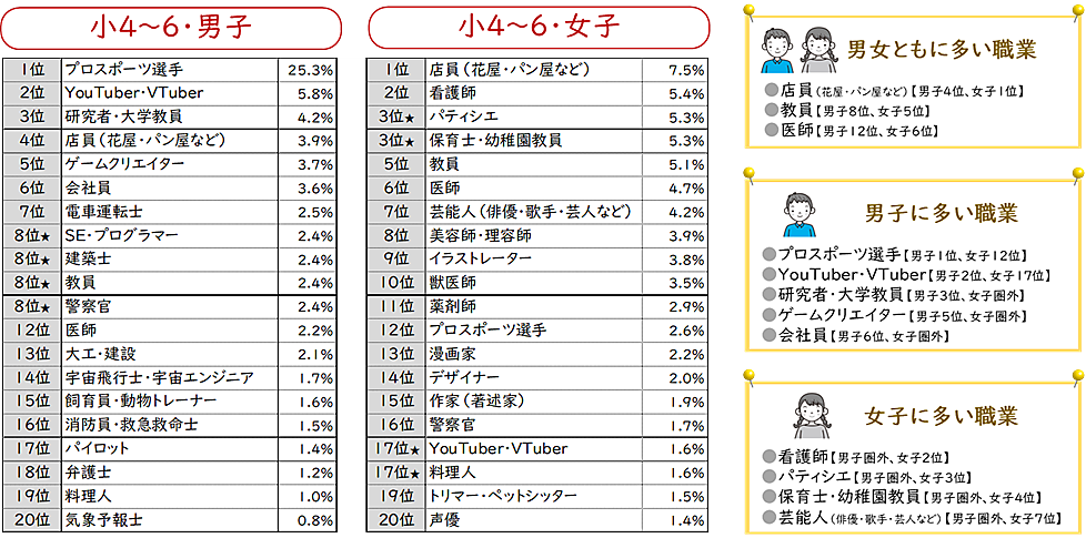 小4~6の人気No.1は「プロスポーツ選手」だが中学生では「教員」「プロスポーツ選手」が同率1位、高校生では「教員」が1位となり、中高生では教員人気が高い。また男女による違いを見ると、小4~6では、男子の25%が「プロスポーツ選手」をあげ、これに「YouTuber・VTuber」「研究者・大学教員」が続く一方、女子は「店員(花屋・パン屋など)」が1位で、「看護師」「パティシエ」「保育士・幼稚園教員」となる。中学生では、男子は「医師」「ゲームクリエイター」などが上位にあがり、女子も「看護師」「保育士・幼稚園教員」「医師」があがる。