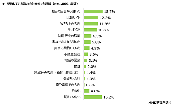 現在契約している電力会社を知った経緯を聞くと、「お店の店員から聞いた」が15.7%と最も多く、以下「比較サイト」が12.2%、「WEB上での広告」が11.9%と続いた。