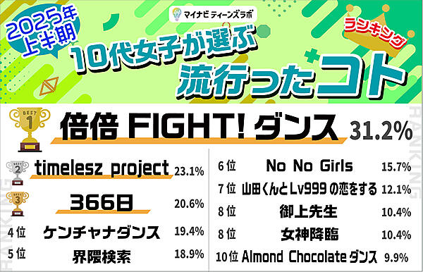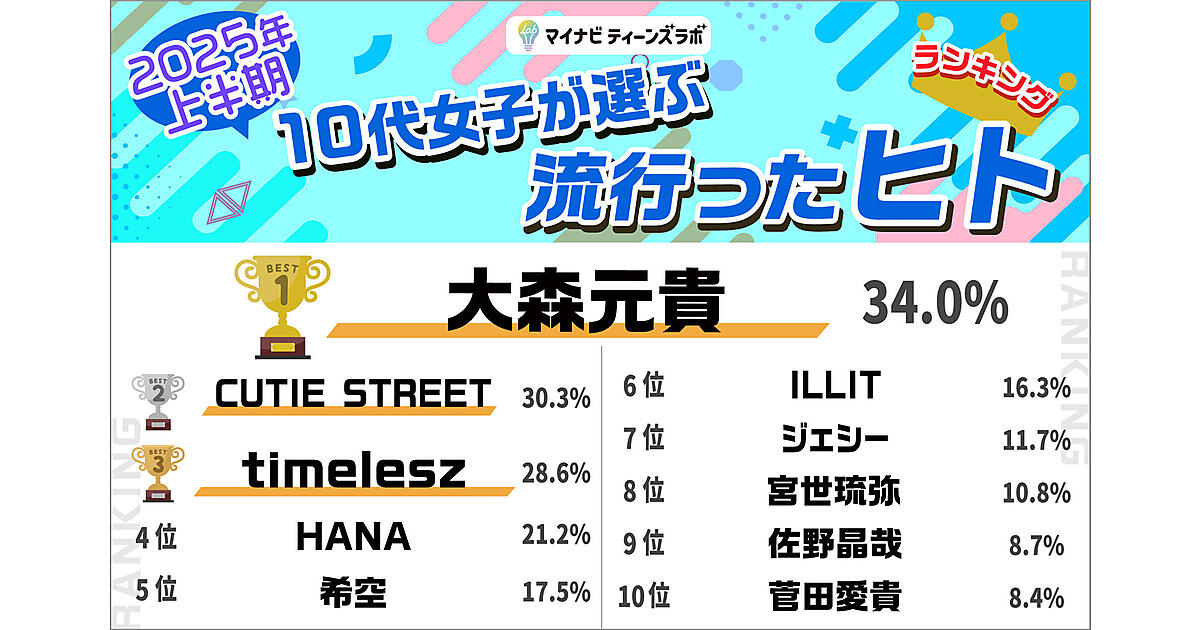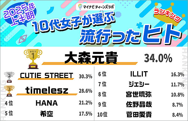 マイナビが運営する「マイナビティーンズラボ」は、「2025年上半期10代女子が選ぶトレンドランキング」を発表した。ヒト、コトバ、モノ、コト、ウタの5ジャンルについて、13~19歳の女性618人が回答している。2015年に調査を開始し、今年で11年目。