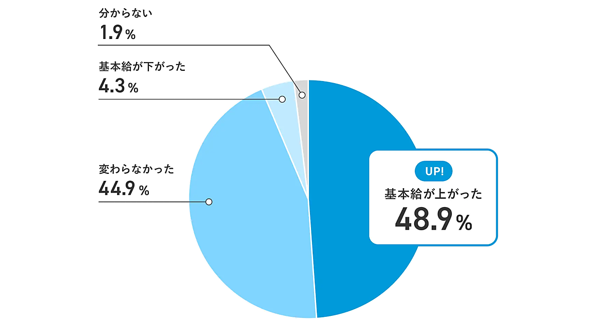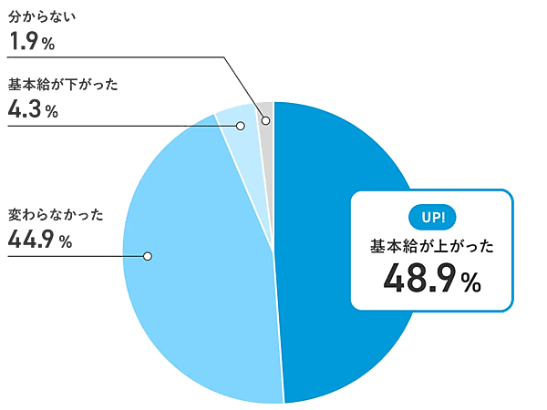 まず、2024年1月と比較して、同年12月の基本給がどのように変化したかを聞いたところ、「上がった」と回答した人が48.9%、「変わらなかった」人が44.9%、「下がった」は4.3%という結果になった。
