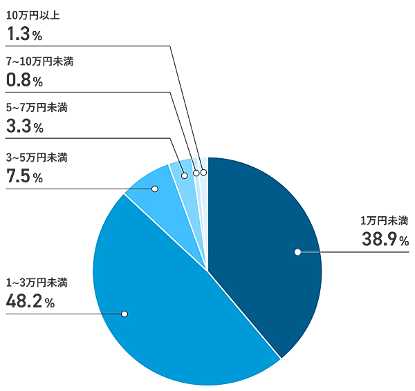 基本給が上がった人にいくら昇給したかを聞くと、「1~3万円未満」が48.2%で最多となり、「1万円未満」が38.9%、「3万円以上」が12.9%と続いた。なお、昇給の平均額は14,701円となっている。