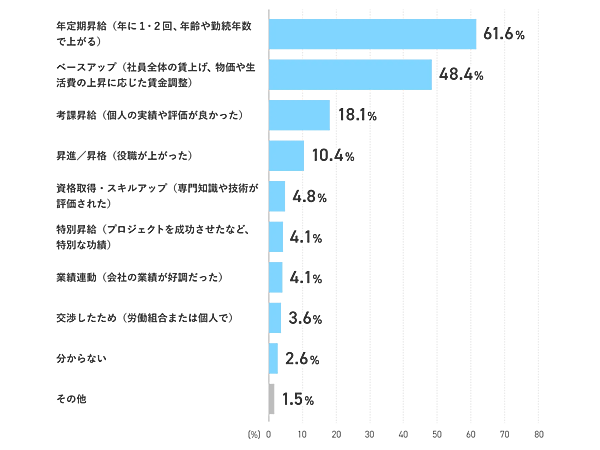昇給した理由としては、「年定期昇給(年に1・2回、年齢や勤続年数で上がる)」が61.6%で最も多く、ついで「ベースアップ(社員全体の賃上げ、物価や生活費の上昇に応じた賃金調整)」が48.4%と半数近くにのぼった。一方で、「考課昇給」「昇進/昇格」「資格取得・スキルアップ」など、個人の努力や成果による昇給も一定数見られた。