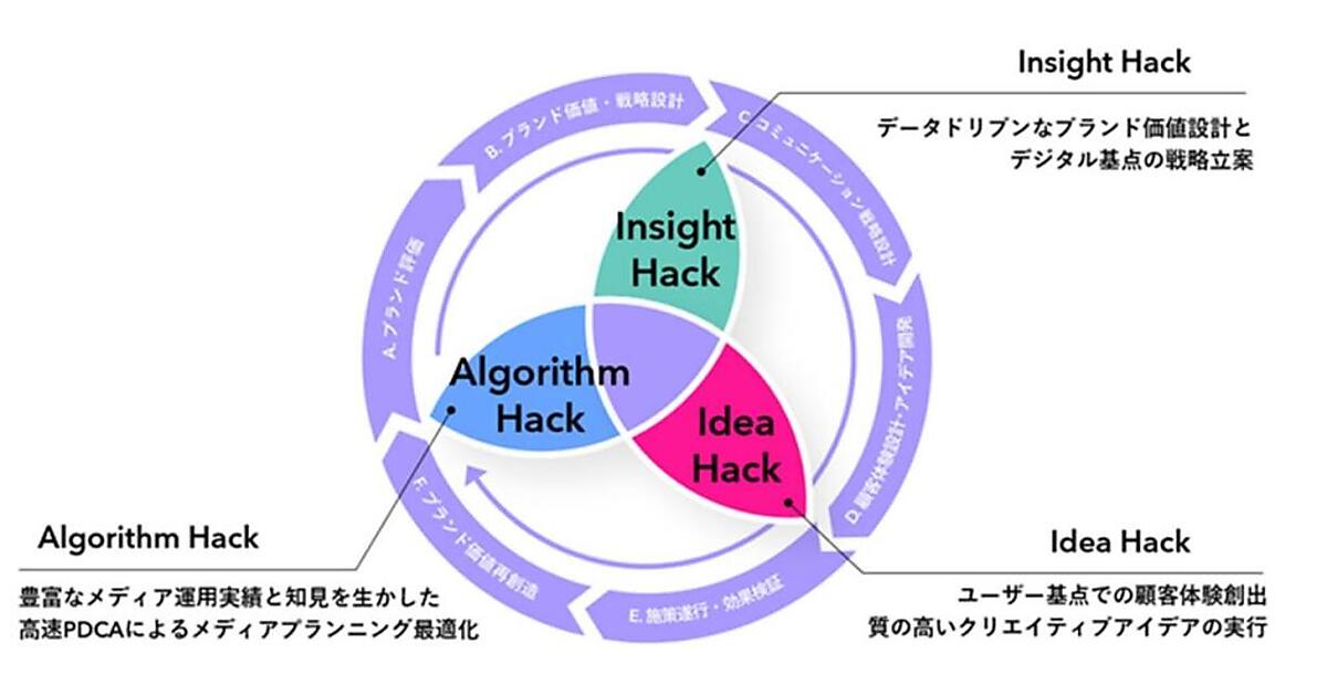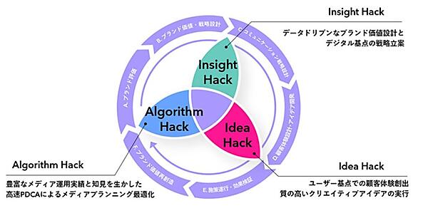 ①Insight Hack、②Algorithm Hack、③Idea Hackの3つの手法で「衝動買い」体験を設計する。①では独自の「Tribe Driven Marketing」でブランド設計やコミュニケーション戦略を立案。②で社内組織の知見や「∞AI(人工知能)」等のAIソリューションを活用してメディアプランニングを最適化する。③は担当者の知見と生成AIを掛け合わせて質の高いクリエイティブアイデアを開発。ユーザー基点での顧客体験創出も支援する。