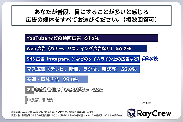 レイクルーは、「消費者の広告接触と購買行動」に関する調査結果を発表した。日常生活で何らかの広告を目にすることがある20代~50代の男女331人が回答している。