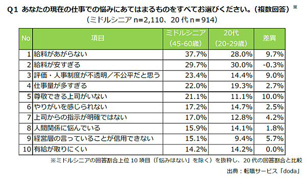 まず、ミドルシニアに「現在の仕事での悩み」を聞いたところ、1位は「給料があがらない」(37.7%)、2位は「給料が安すぎる」(29.7%)と、給与に関する不満が上位を占めた。特に20代の回答を大きく上回っていたのは、「尊敬できる上司がいない」「給料があがらない」「評価・人事制度が不透明/不公平だと思う」などの項目だった。