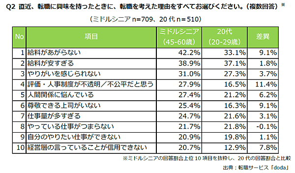 パーソルキャリアが運営する転職サービス「doda(デューダ)」は、「ミドルシニアの転職意識調査レポート」を発表した。20~64歳のビジネスパーソンを対象に、仕事と転職に関するアンケート調査を実施している。