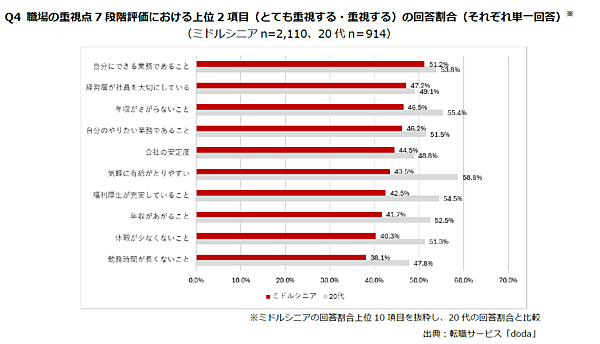 環境・風土に関する職場選びの重視度について聞くと、ミドルシニアは「自分にできる業務であること」が51.2%で最も多く、ついで「経営層が社員を大切にしている」が47.2%、「年収が下がらないこと」が46.5%となった。一方で、20代は休暇の取りやすさや福利厚生の充実に関する項目が過半数にのぼっていた。