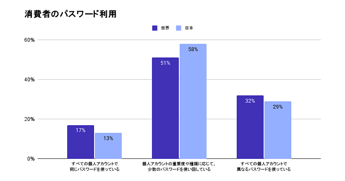 続いて、パスワードの利用実態について聞いたところ、9カ国平均では「すべての個人アカウントで同じパスワードを使っている」が17%、「少数のパスワードを使い回している」が51%となった。日本ではこの傾向がさらに強く、合計で71%がパスワードを再利用していると回答。世代別に見ると、日本のZ世代では31%が「すべての個人アカウントで同じパスワードを使っている」ことが明らかになった。