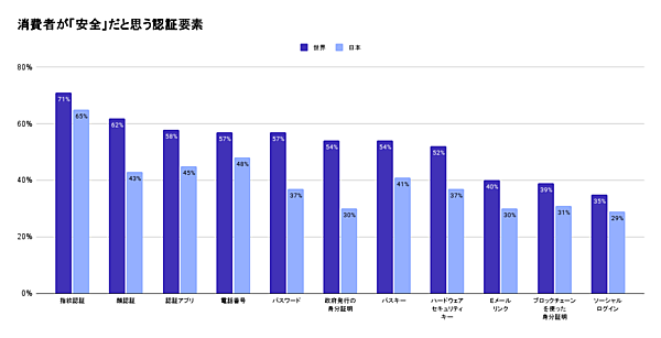 また、「便利」だと思う認証要素を聞くと、「パスワード」は9カ国の平均が73%だったのに対し、日本では56%にとどまる結果に。安全性の評価についても同様に、世界平均を下回る傾向が見られたが、「指紋認証」については日本でも65%が「安全」と感じていた。