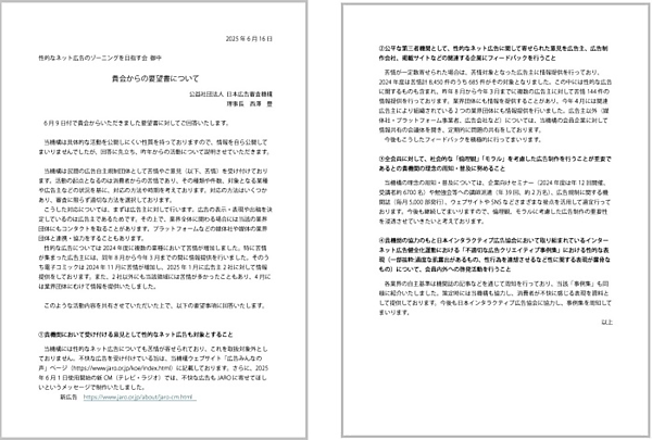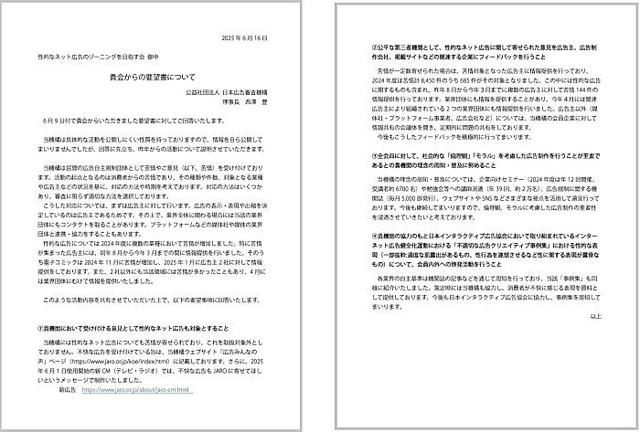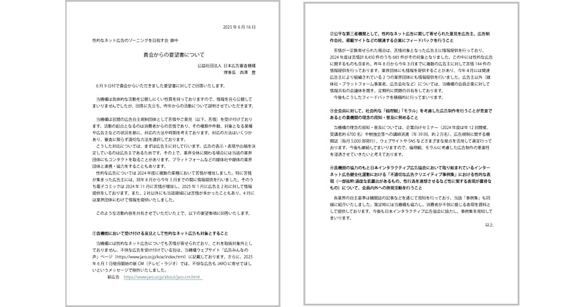 4項目の要望すべてにJAROは回答した。性的ネット広告の取り扱い対象化では、すでに苦情を受け付けていて、取り扱い対象外としていないと明言。6月1日から放送開始の新CMでも「ネット上の広告や不快な広告もJAROへ」と呼びかけている。関連企業へのフィードバックでは、24年度の苦情8450件のうち685件を広告主に情報提供し、性的広告関連では144件の苦情情報を複数の広告主に提供。2つの業界団体にも情報を共有した。