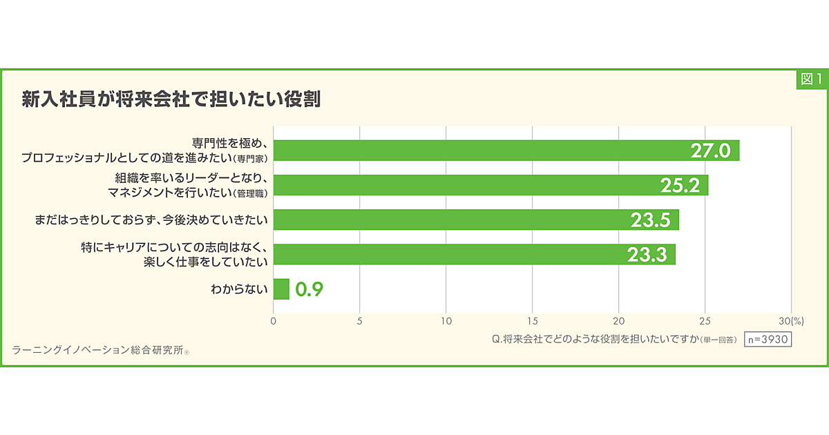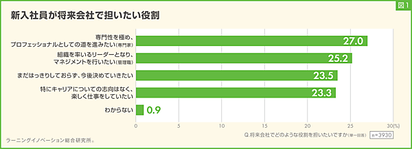 まず「将来会社でどのような役割を担いたいか」を聞くと、「専門性を極め、プロフェッショナルとしての道を進みたい(専門家)」27.0%が最多。以下「組織を率いるリーダーとなり、マネジメントを行いたい(管理職)」25.2%、「まだはっきりしておらず、今後決めていきたい」23.5%、「特にキャリアについての志向はなく、楽しく仕事をしていたい」23.3%が続くが、大きな差はなくほぼ四分されている。