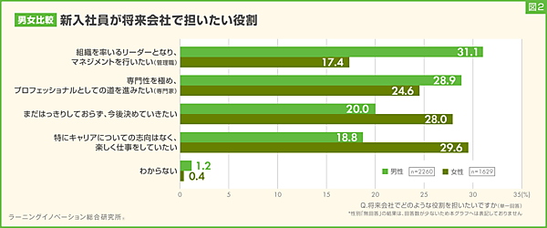 性別で比較すると、男性は「管理職」「専門家」「今後決めたい」「楽しく仕事をしていたい」の順、女性は逆に「楽しく仕事をしていたい」「今後決めたい」「専門家」「管理職」の順だった。